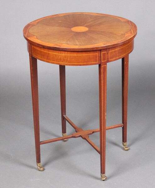 Lot 965 An Edwardian circular inlaid and crossbanded mahogany occasional table, the top inlaid 8 radiated panels, raised on square tapered supports with H framed stretcher, brass caps and casters 71cm h x 72cm w c 55cm d £70-90