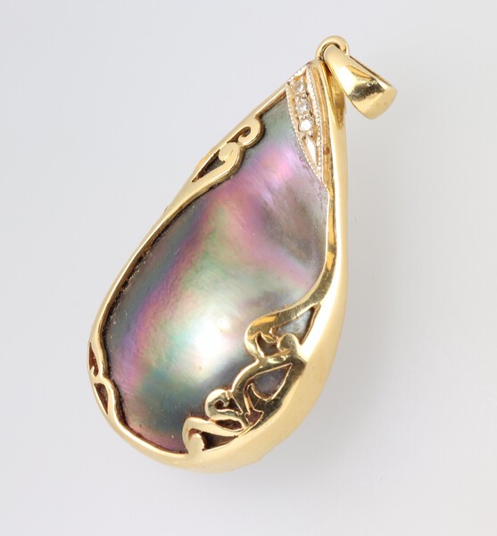 A gold marked 18K abalone and diamond set pendant 4cm, 10g