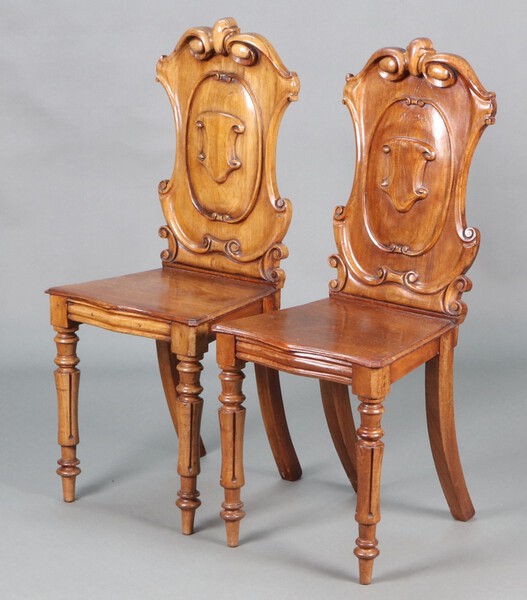 Lot 982 A pair of Victorian carved mahogany shield back hall chairs with solid seats of serpentine outline, raised on turned and fluted supports 96cm h x 40cm w x 34cm d £60-80