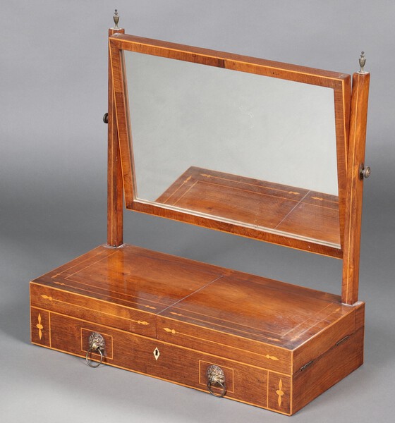 A William IV rectangular plate dressing table mirror contained in a mahogany swing frame, the base with hinged lid fitted 5 lidded compartments, having an ivory escutcheon 64cm h x 61cm w x 28cm d - With non-transferable standard ivory exemption declaration number F1MEKGYW