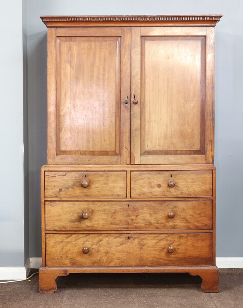 A large section of dentil is missing from the cornice, section of moulding and 2 sections of veneer are missing from the door, 3 sections of moulding missing from the base, section of veneer missing to the right side of the door, the handles are damaged