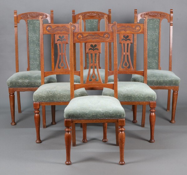 A harlequin set of 6 Art Nouveau Liberty style carved oak high back dining chairs comprising 3 carved oak dining chairs with pierced vase shaped slat backs and over stuffed seats, raised on turned supports 105cm high x 46cm w x 43cm d and 3 similar high back dining chairs with carved cresting rail, upholstered splat backs, raised on turned supports 107cm h x 47cm w x 43cm d