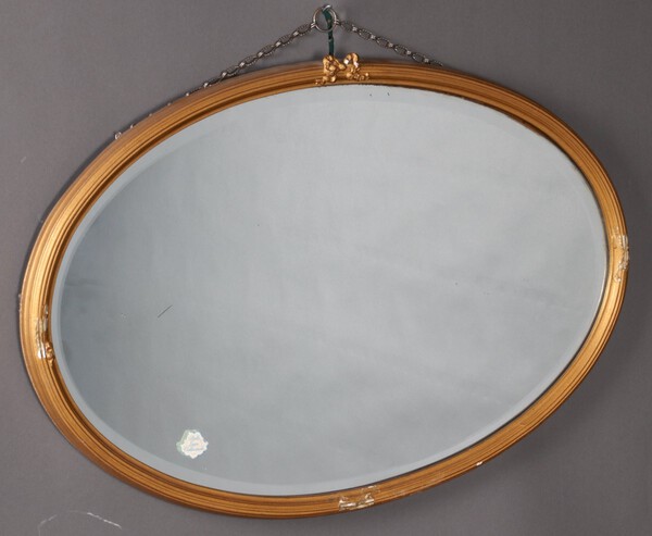 Lot 985 An Edwardian oval bevelled plate wall mirror contained in a gilt reeded plaster frame surmounted by a garland 55cm x 80cm £40-60