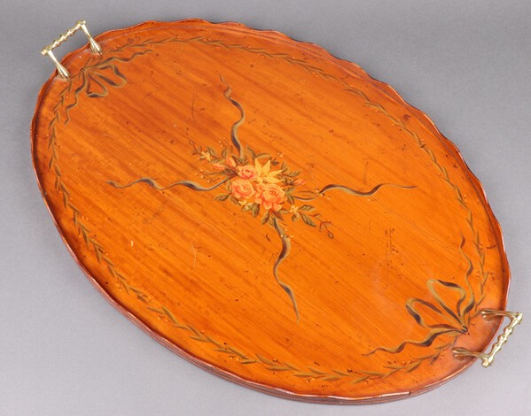 Lot 986 A 20th Century Sheraton style oval painted satinwood twin handled tea tray 69cm w x 46cm d £50-75