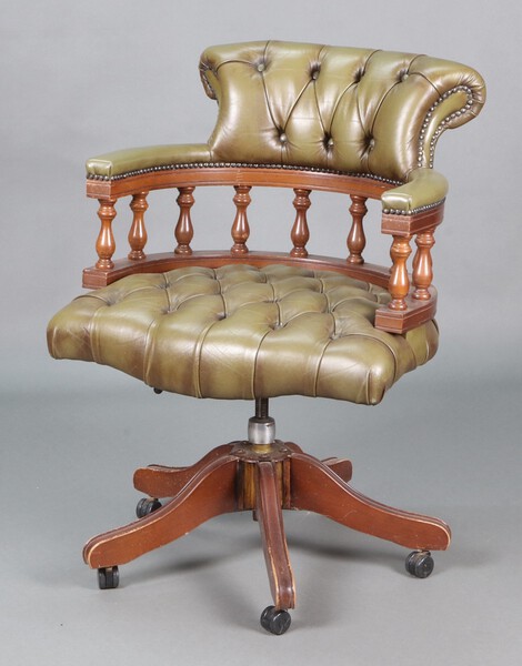 Lot 988 A beech framed Captain's revolving office chair upholstered in green buttoned leather 87cm h x 62cm w x 56cm d £100-150