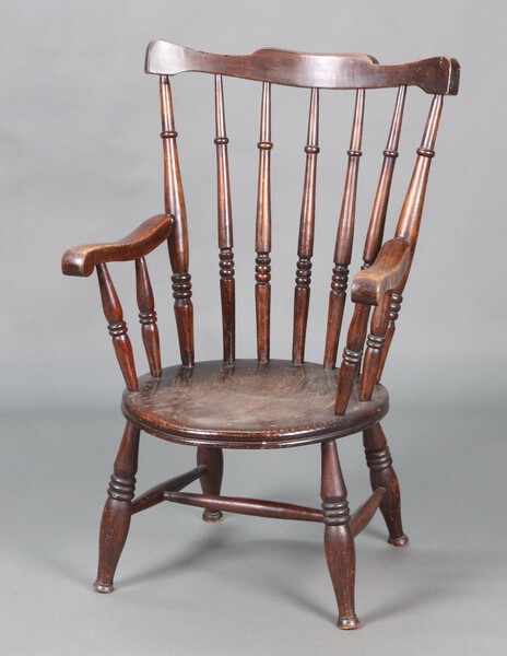 Lot 990 A 19th Century beech and elm stick and rail back Windsor kitchen carver chair with circular seat, raised on turned supports with H framed stretcher 91cm h x 57cm w x 46cm £60-80