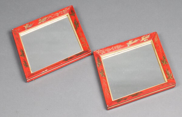 Lot 990 A pair of 1930's diamond shaped plate mirrors contained in red and gilt chinoiserie style frames decorated birds 44cm x 35cm £80-120