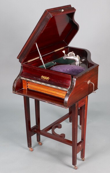 A mahogany "'Operaphone" gramophone in the form of a baby grand piano with fallboard revealing sound vents, the hinged top revealing turntable, Belma Royal Concert Soundbox, record storage and needle compartment, raised on stretchered square supports and castors 90cm h x 54cm w x 81cm d