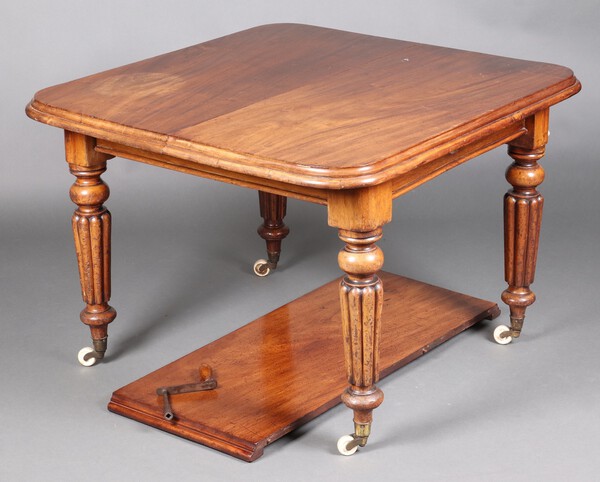 Lot 998 A Victorian mahogany extending dining table, raised on turned supports with ceramics caps and casters 70cm h x 101cm w x 102cm l x 146cm when extended (complete with winder) £60-80