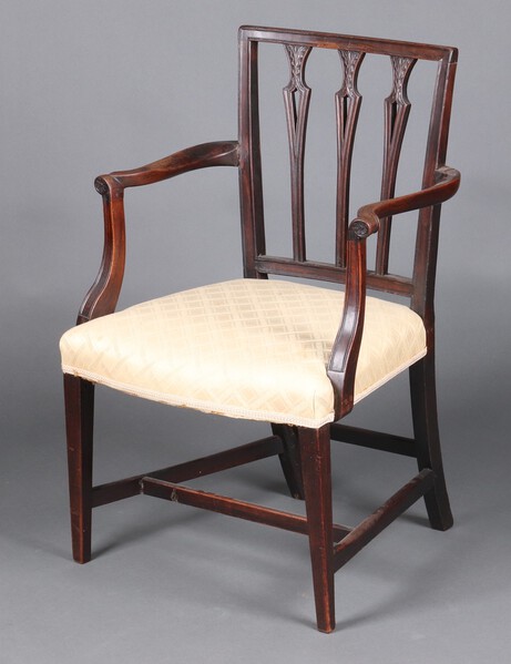 Lot 998 A 19th Century mahogany stick and rail back open arm desk/carver chair with overstuffed seat 88cm h x 58cm w x 45cm d £40-50