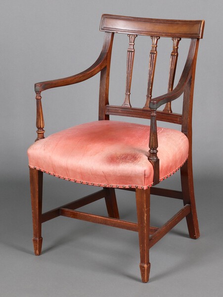 Lot 999 An Edwardian Georgian style mahogany stick and rail back carver/desk chair, seat upholstered in bleached red leather, on square tapered supports, spade feet 88cm h x 54cm w x 46cm d £50-75