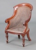 | 54 | A child's 19th Century mahogany tub back training chair with woven cane seat and back, raised on turned supports 61h x 36w x 33d (old metal bracket repairs to the back) | 20-30 |