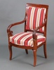| 68 | A French carved mahogany Empire style open armchair, the seat and back upholstered in striped material, raised on outswept supports 91h x 55w x 44d (arms heavily scratched) | 20-30 |