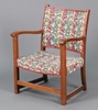 | 96 | A 1930's oak framed open arm chair, the seat and back upholstered in tapestry material 69cm h x 53cm w x 41cm d | 20-30 |