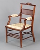 | 107 | An Edwardian inlaid mahogany open arm chair with spindle back and upholstered seat, raised on turned supports 84cm h x 47cm w x 41cm d | 30-40 |