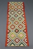 | 108 | A green, turquoise and orange ground Chobi Kilim runner with all over stylised diamond design 197cm x 66cm | 40-50 |