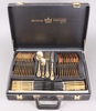 | 124 | A Bestecke Solingen 70 piece canteen of gold plated flatware for 12 and including a flan lifter, 3 serving spoons, soup ladle, sauce ladle, pair of tongs, jam spoon and 2 pastry serving forks, all contained in a briefcase | 40-60 |