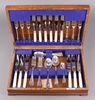 | 143 | A 42 piece canteen of silver plated Old English rat tail pattern cutlery (1 knife handle damaged) in an oak box marked Harrods Ltd. | 30-40 |