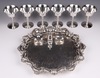 157 An engraved silver plated salver with bracketed border 38cm, a 3 piece silver plated condiment set and 6 plated champagne coups 30-40