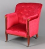 161 An Edwardian inlaid mahogany tub back chair upholstered in red material, raised on square supports with brass caps and casters 79cm h x 64cm w x 54cm d 30-40