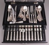176 A 64 piece of matched silver plated flatware comprising 10 dinner knives, 9 forks, 10 pudding knives, 11 forks, 7 soup spoons, 4 serving spoons, 7 table spoons, 7 tea spoons, 3 unmatched soup spoons and 2 forks, contained in an ebonised canteen with drawer 70-90