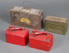 | 387 | A 1949 303 wooden ammunition box 22cm x 40cm x 12cm, a rectangular meal ditto (lid a/f), 2 red painted petroleum spirit petrol cans | 30-40 |
