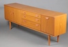 | 389 | A Schreiber wooden laminate finished sideboard, fitted 3 drawers flanked by cupboards and cocktail unit, raised on turned supports 73cm x 199cm w x 43cm d | 40-60 |