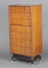 | 390 | A mid-century teak chest of 7 drawers with gilt metal handles, raised on ebonised supports 127cm h x 61cm w x 40cm d | 40-50 |