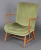 | 470 | An Ercol beech and elm open arm chair upholstered in green material, raised on turned supports 80cm h x 56cm w x 48cm d | 30-50 |