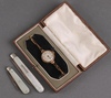 | 566 | A lady's gilt cased wristwatch and 2 silver mounted fruit knives | 20-30 |
