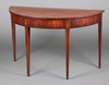 | 733 | A 19th Century demi-lune crossbanded mahogany side table, inlaid shells to the top of the legs, raised on 4 square tapered supports 76cm h x 122cm w x 55cm d (formerly a section of a dining table) | 20-30 |