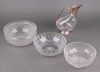 | 740 | A silver plated mounted ewer in the form of a duck 25cm and 3 glass bowls | 20-30 |