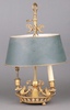 | 78 | A gilt metal twin light table lamp with green pressed metal shade on a pierced circular base 52cm h (shade a/f, 1 light a/f) | 20-25 |