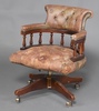 | 113 | A captains style revolving office chair upholstered in bleached green leather 78cm h x 60cm w x 56cm d (some damage to seat) | 30-40 |