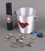 | 398 | A Bollinger aluminium wine cooler together with a kaleidoscope - The Optical Fragments of The Isle of Wight , 2 cloisonne enamelled napkin rings and various souvenir spoons | 30-40 |
