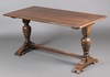 | 68 | An oak refectory style dining table, raised on bulbous turned supports with H framed stretcher 74cm h x 152cm l x 75cm w | 30-40 |