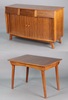 | 129 | A mid-century rosewood finished dining suite comprising sideboard fitted 3 drawers above cupboard enclosed by tambour shutter on outswept supports 86cm h x 137cm w x 51cm d and extending dining table on outswept supports 75cm h x 107cm x 76cm (3cm section of timber missing to the top) | 30-50 |