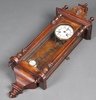 | 142 | A regulator style wall clock with enamelled dial, Roman numerals and grid iron pendulum, contained in a walnut case | 30-40 |