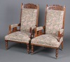 158 A pair of Art Nouveau carved walnut open arm chairs upholstered in floral patterned material, raised on turned supports 113cm h x 67cm w x 61cm d (frames loose, sun bleached in places) 20-30