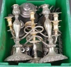 174 A pair of embossed silver plated candlesticks, a 3 light candelabrum, a 7 bar toast rack, sugar bowl and cream jug and other plated items 30-40