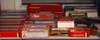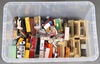 200 A collection of various model train rails, a transformer, etc in a plastic box, together with a collection of rails in a fruit box 20-30