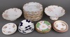 | 298 | An Aynsley style porcelain biscuit jar and cover decorated with fruits, 2 condiments, a salad bowl, cup and plat, together with a pair of Noritake candlesticks decorated a dessert scene, matching trinket box and cover (lid a/f) and 2 other items | 30-40 |