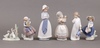 184 A collection of Lladro figures to include standing girl with basket of puppies 1311 23cm, standing boy and girl 1.15M5, boy with yacht 94, boy with 2 pails 53 and standing girl 564 40-50