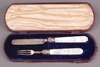 | 419 | A Victorian 2 piece cased christening set with knife and fork having silver blade and mother of pearl handles | 30-40 |
