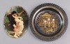 | 431 | An oval concave painting on glass, study of a boy and girl on swing 14cm x 10cm together with a circular black and gilt lacquer tray 16cm | 30-40 |