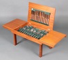 441 A 53 piece Viners Studio pattern canteen of chromium plated flatware - 6 table knives, 6 forks, 6 tea knives, 6 fish knives, 6 forks, serving spoon and fork, 2 serving spoons, 6 tea spoons, 6 spoons, 6 soup spoons, 6 forks, all contained in a rectangular teak coffee table with hinged lid, raised on square supports 37cm h x 119cm w x 44cm d 30-50