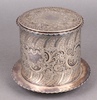 | 460 | A James Dixon & Sons cylindrical embossed silver plated biscuit barrel with hinged lid, raised on bun feet 15cm | 30-40 |