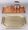 | 465 | A 19th Century copper jelly/ice cream mould 6cm, 19th Century copper kettle, twin handled tea tray, 2 lozenge shaped trays | 30-40 |