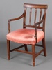 | 45 | An Edwardian Georgian style mahogany stick and rail back carver/desk chair, seat upholstered in bleached red leather, on square tapered supports, spade feet 88cm h x 54cm w x 46cm d | 20-30 |