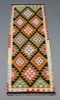 | 35 | A green, black and orange ground Maimana Kilim runner with overall diamond design 195cm x 64cm | 30-40 |